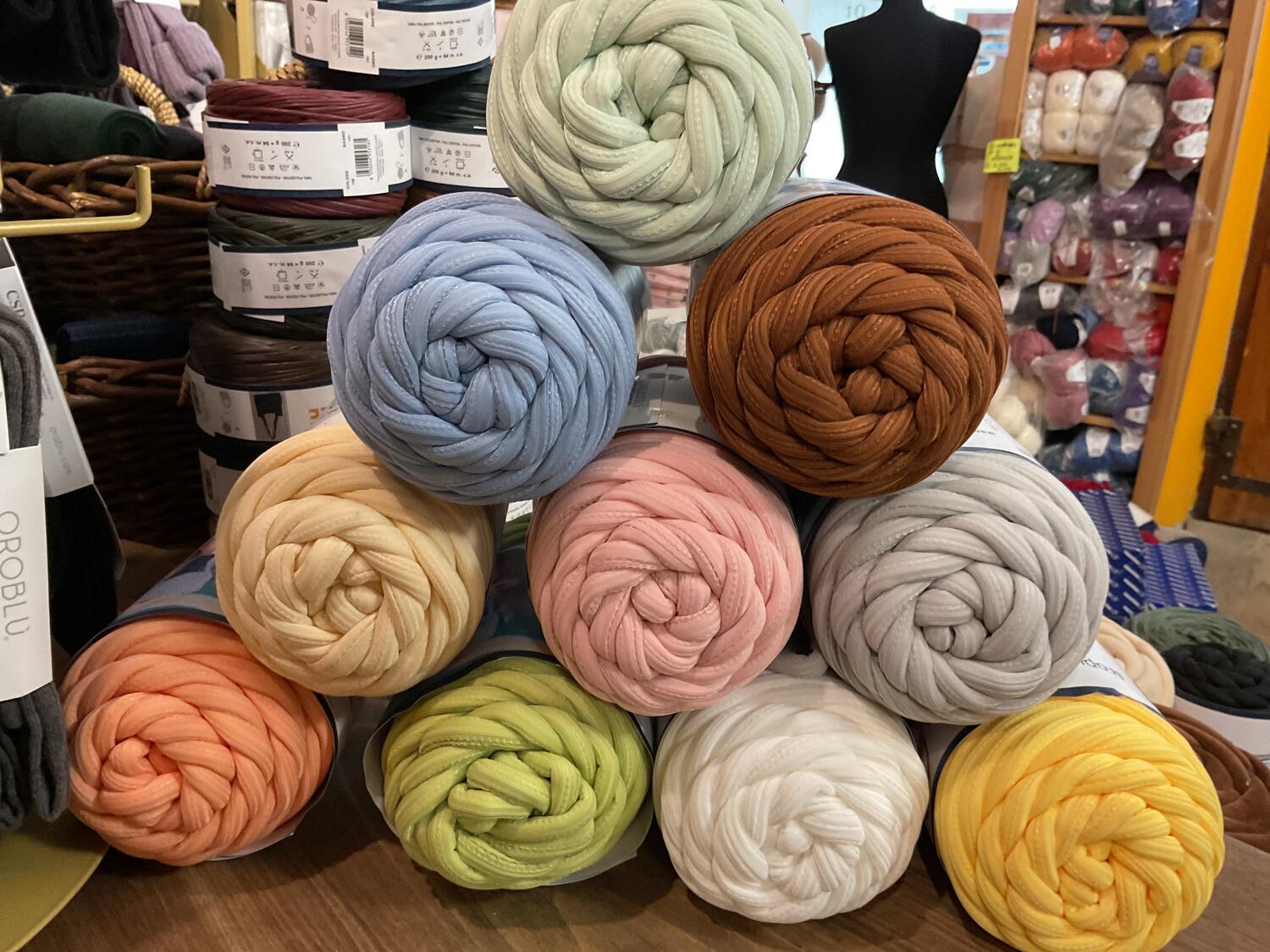 Rotoli di microfibra da 250 gr x 30 m circa da lavorare col uncinetto 12 e ferri 15, adattana borse cestini tappetini e tutto quello che può suggerire La fantasia,composta da 97% microfibra in poliestere e 3% spandex